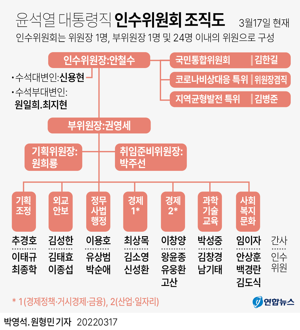 일단 인수위만 보면 새민련의 부활입니다. 윤석열을 축으로 이준석의 국민의힘과 안철수ㆍ김한길의 새정치민주연합, 그리고 옛 친이세력이 한배를 탄 모양새입니다. 자유주의자들이 그들과 다시 싸워야 할 시기가 왔습니다.