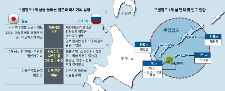 그런데 러일전쟁 이전 1855년 일본은 러시아측과 홋카이도쪽 4개 섬을 점유하는 걸로 조약을 맺었었고, 이후 1875년 일본과 러시아가 상트페테르부르크 조약을 맺으면서 쿠릴 열도는 일본이 점유하고 사할린은 러시아가 점유하기로 하였었습니다. 그러다가 러일전쟁 이후 사할린 남쪽을 일본이 점유했던 것인데요. 태평양 전쟁 막바지에 러시아가 남하하면서 사할린은 물론 쿠릴 열도도 점유했고, 더 나아가 홋카이도까지 점유하려 했었습니다. 그렇지만 홋카이도 점유를 미국이 막아서 홋카이도는 일본에 반환했고, 쿠릴 열도가 문제가 되었는데요. 일본은 일단 쿠릴 열도를 포기하는 샌프란시스코 조약에 서명은 했습니다만, 이후 1950~1960년대 들어 홋카이도에 가까운 4개 섬은 쿠릴 열도에 포함되지 않는다 주장하며 반환을 요구하게 됩니다.