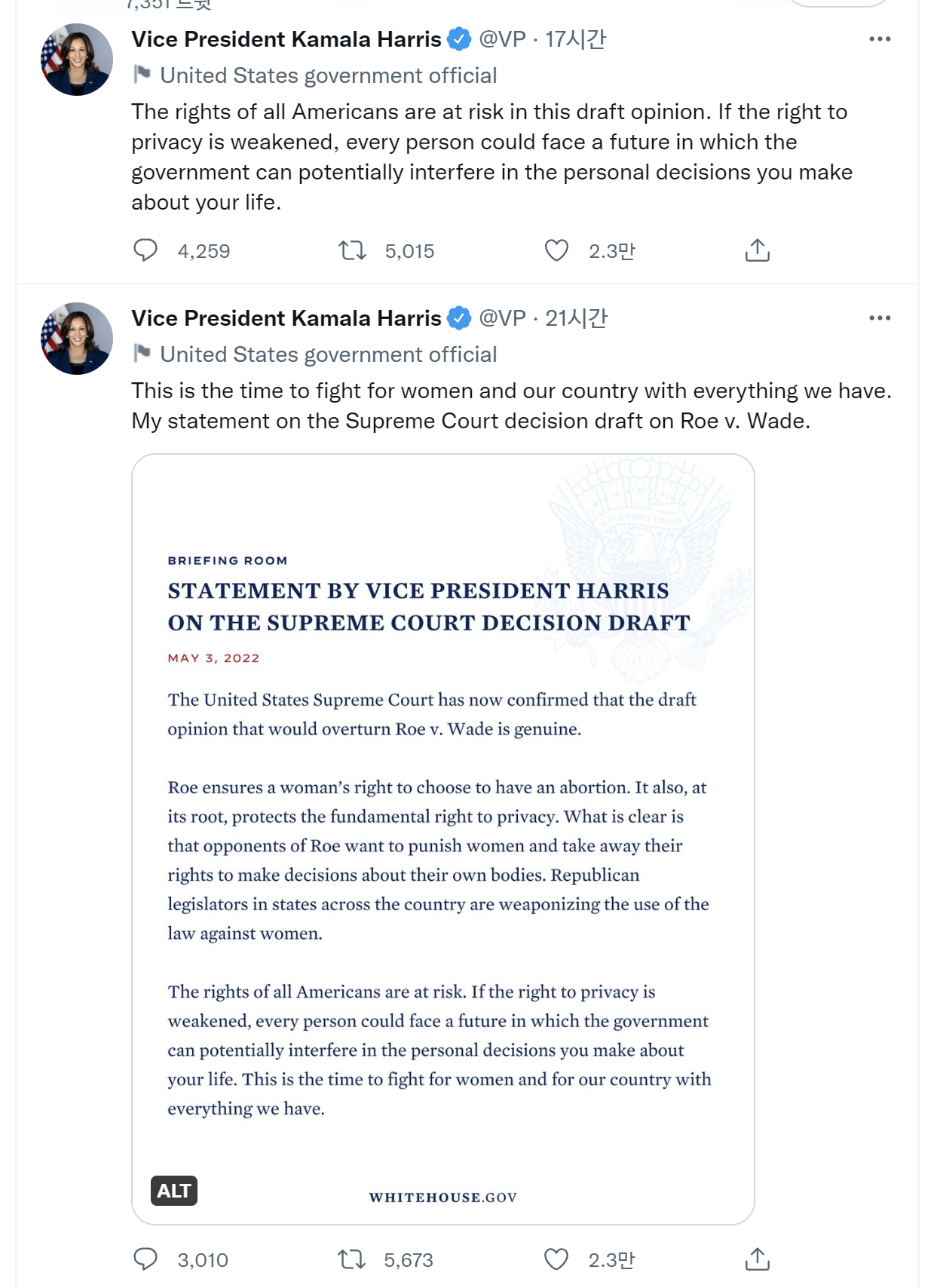 이에 백악관에서 나서서 로 대 웨이드 판례를 엎는 것을 반대하고 있으며, 민주당은 관련하여 연방 입법을 통해 관련 문제를 해결하려는 움직임을 보이고 있습니다. 현재 상하원은 민주당이 차지하고 있지만, 대법관 중에는 트럼프가 임명한 보수우익 성향 대법관이 많습니다.