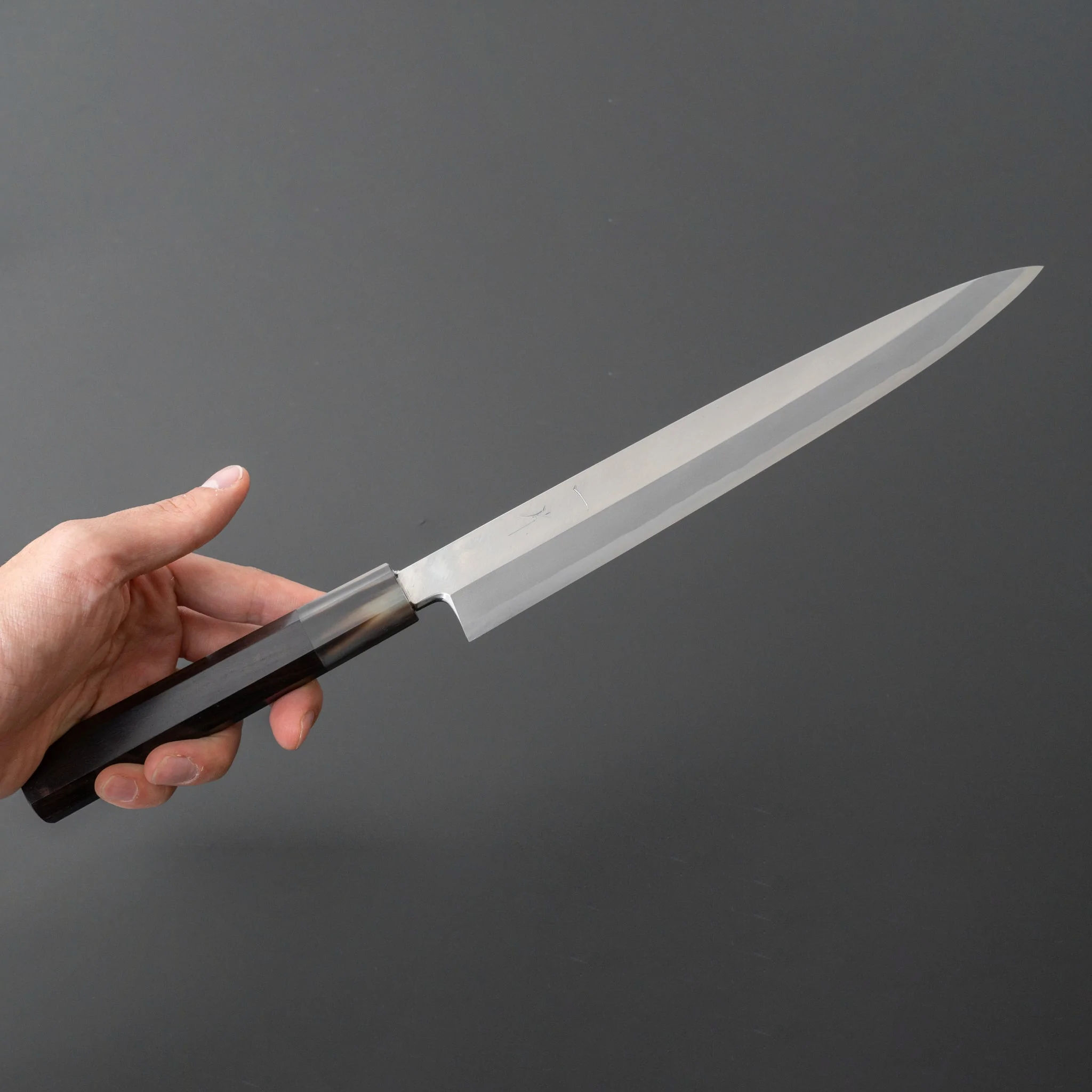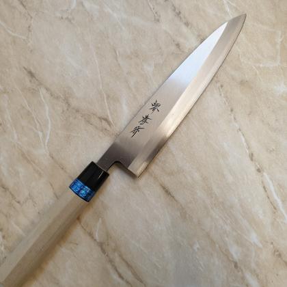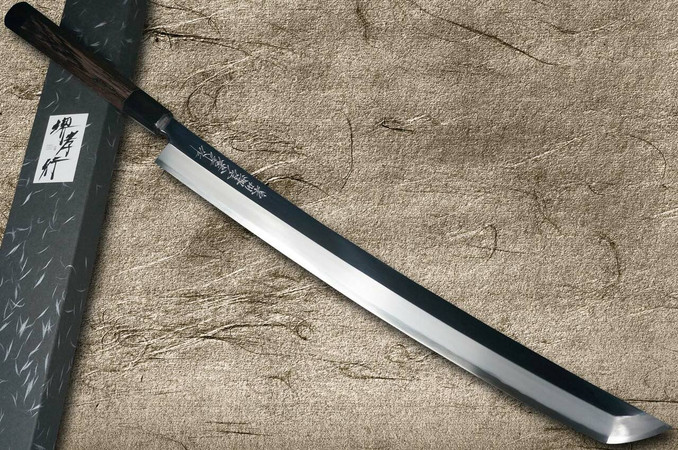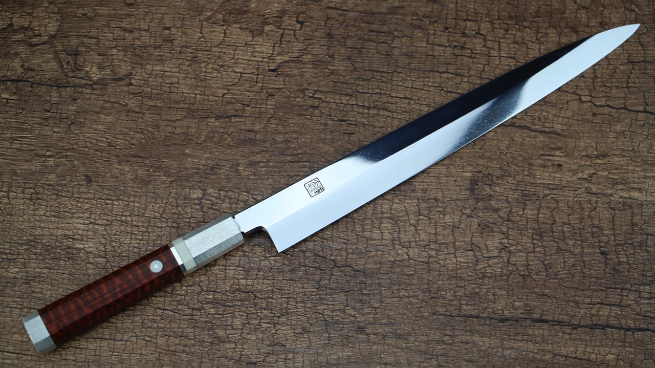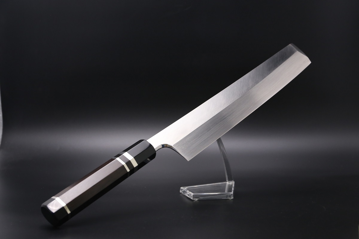 정식 명칭은 야나기바보초. 줄여서 야나기바. 통칭 야나기로 부릅니다. ‘쇼부’라고도 합니다. 원래 일본어로 야나기는 버드나무라는 뜻인데, 버드나무 잎을 닮았다 하여 야나기바보초라는 이름이 붙었습니다. 흔히 생각하는 회칼입니다. 사실 회칼도 종류가 많은데, 대중적으로 알려진 회칼은 야나기입니다. 끝이 뾰족하고, 날폭이 얇고 깁니다. 대신 칼등을 보면 일반적인 주방칼보다 제법 두껍습니다. 길고 칼등이 두껍기 때문에 무게도 제법 있습니다. 야나기가 괜히 이 시대의 전투도검이 아닙니다. 야나기의 절삭력은 어느 정도는 날의 질량에서 비롯된다고 생각합니다.