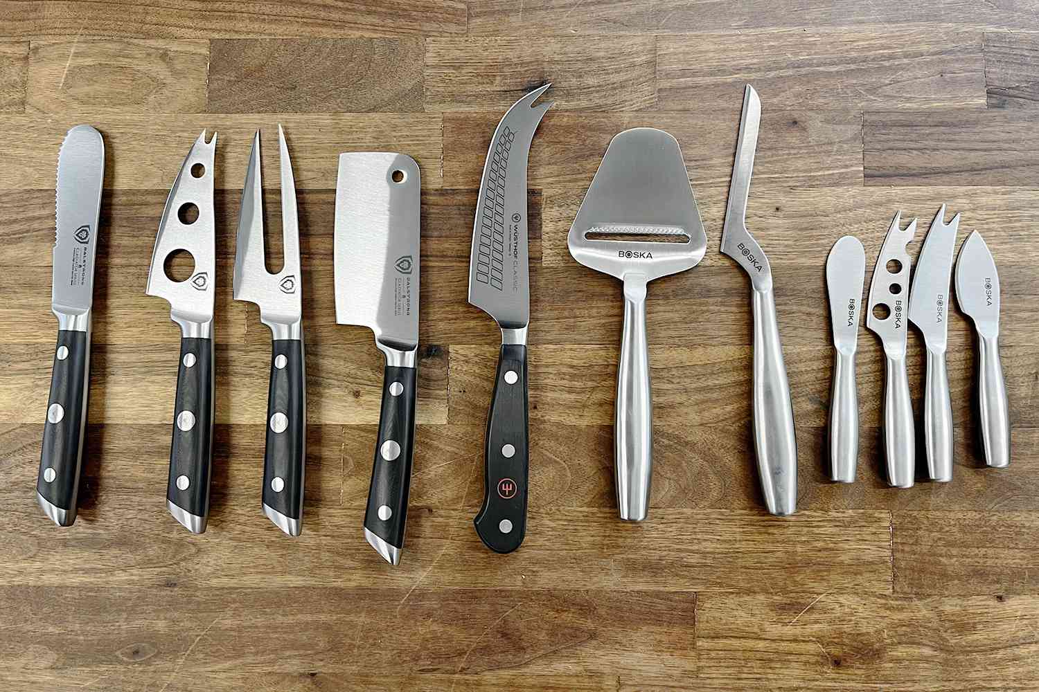 치즈는 굳이 자르자면 뭘로 잘라도 안 잘리지는 않는데, 그렇다고 쉽게 잘 잘리는 물건도 아닙니다. 연성이나 반경성 치즈는 자를 때 치즈가 날에 묻으면서 잘리는 걸 방해하고, 경성 치즈는 잘 바스라지거든요. 그래서 치즈 나이프는 가능한 예리하고 얇으면서 날면의 단면적을 좁힌 형태가 되어있습니다. 보통 날에 커다랗게 구멍을 뚫어놓지요. 또 원체 치즈가 잘 안 잘리다보니 서레이티드(톱날) 처리가 된 것도 많고, 아니면 야나기처럼 날을 한쪽면만 연마한 편각날인 것도 있습니다. 때때로 일부 브랜드에서는 연성 치즈, 반경성 치즈, 경성 치즈용 칼을 따로 제작해 세트로 판매하기도 합니다. 연성 치즈의 경우 칼이 아니라 실로 자르기도 하는데, 실을 고정해서 쉽게 자를 수 있는 절단 키트 같은 것도 있긴 합니다.