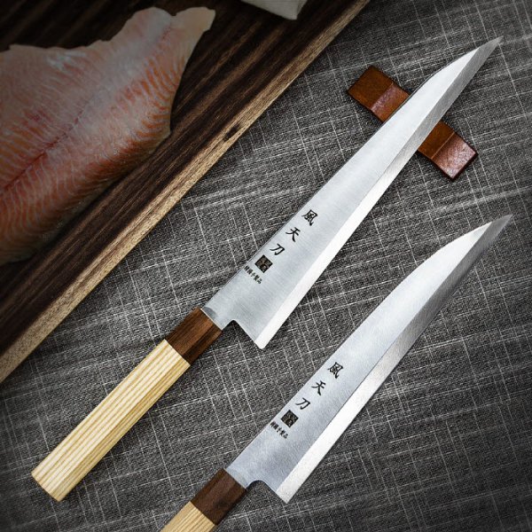 복어칼입니다. 복어는 살이 단단하기 때문에 회를 뜰 때 일반 생선회보다 얇게 뜹니다. 그래서 후쿠히키는 일반적인 야나기 등에 비해 칼등 쪽이 얇습니다. 그 외 생긴 건 야나기와 같습니다. 일반적인 야나기는 칼등이 꽤 두꺼운 칼이기 때문에 회를 아주 얇게 뜨는 데는 적합하지 않습니다.