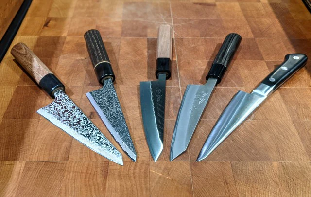 작은 채소칼. 끝쪽은 키리츠케처럼 사선이며, 날은 편각날입니다. 채소를 기술적으로 잘라 장식 등을 만드는 데 사용하는 칼입니다. 일반적으로 쓰기에도 우스바 대비 작아서 사용하기 편하다는 사람들도 있습니다.