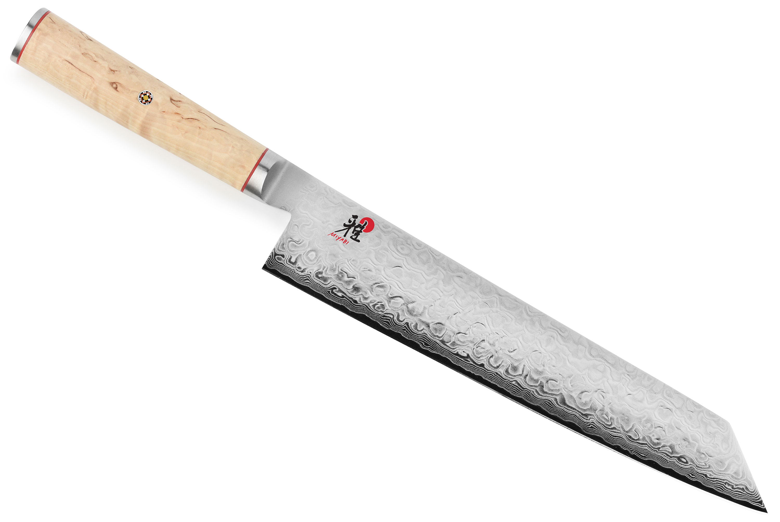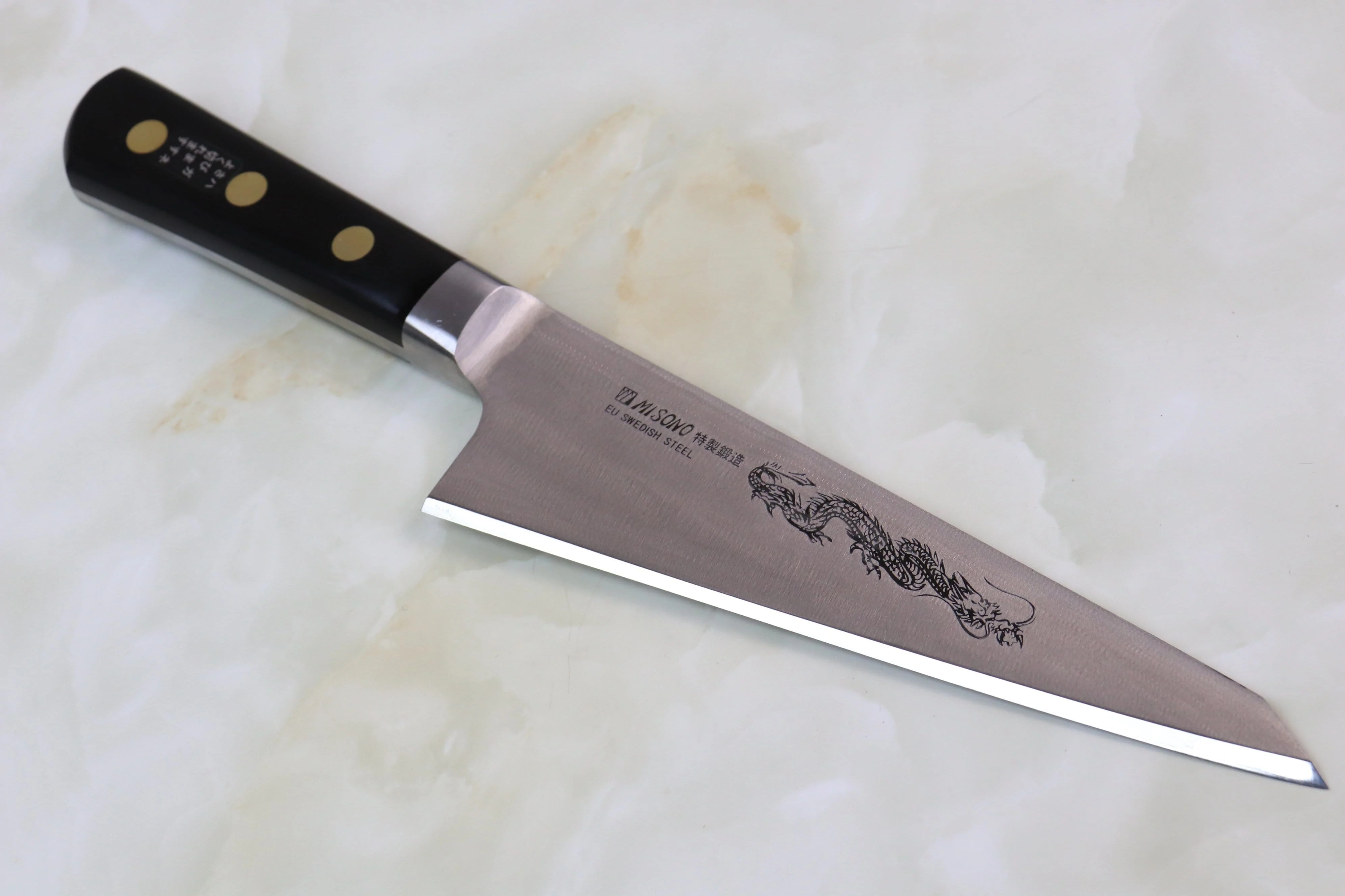 규토의 경우, 키리츠케 규토는 일반 규토보다 칼끝이 훨씬 뾰족해지게 됩니다. 야나기는 원체 날카로운 칼이다보니 키리츠케 회칼이 야나기에 비해 칼끝이 덜 날카로운 반면, 규토는 날끝이 많이 뾰족해져서 공격적인 모양새가 됩니다. 날끝으로만 음식물을 자를 때 얇은 날폭을 활용할 수 있습니다. 대신 규토의 특징인 곡률이 부족해지기 때문에 곡률을 활용할 수 있는 여지는 크게 줄어듭니다. 정리하자면 곡률은 서양식 셰프 나이프 > 일본식 규토 > 키리츠케 규토입니다. 날카로운 칼끝을 활용할 때는 키리츠케 규토가, 곡률을 이용한 절삭력이 필요할 때는 서양식 셰프 나이프가 좋습니다.