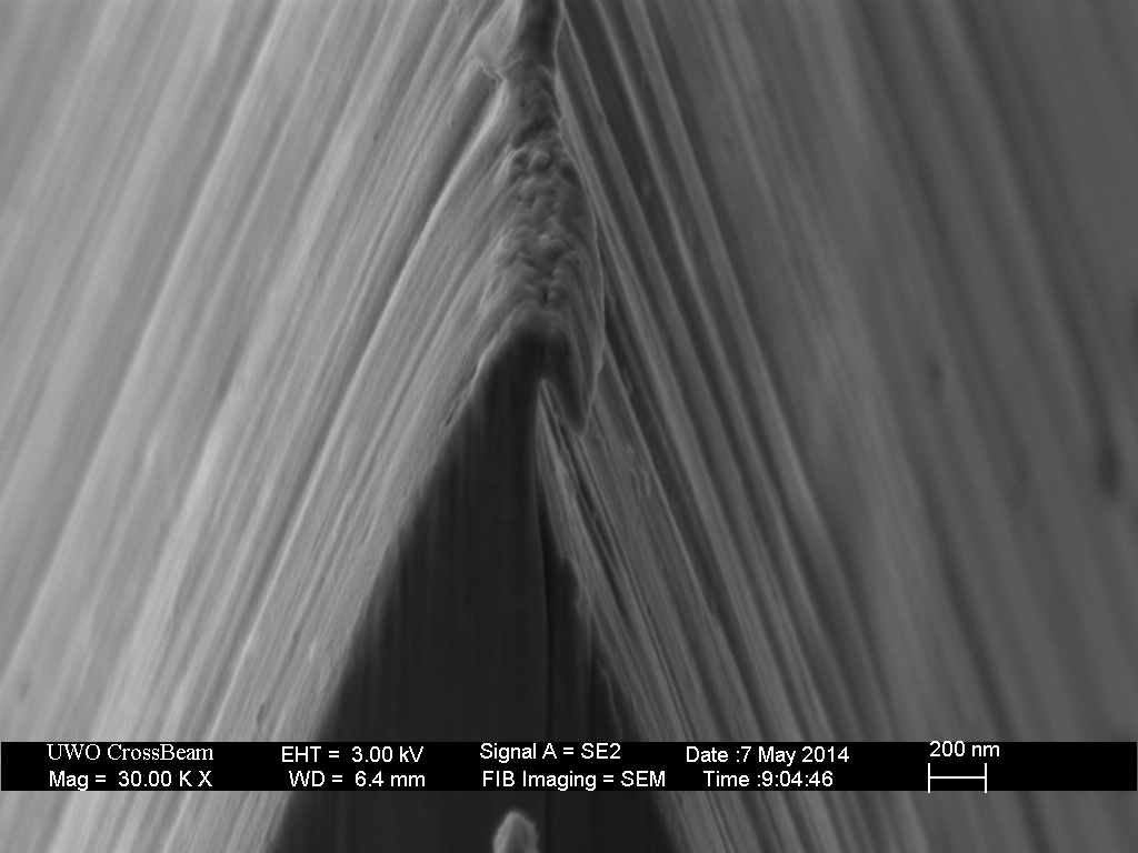 완벽하게 날을 세운다고 한다면 날끝이 분자 하나만큼의 두께가 되면 이상적인 두께입니다만, 금속 칼의 경우 그 정도로 날을 세우기는 현실적으로 쉽지 않고, 그런 두께의 칼날은 유지되기 어렵습니다. 그러나 이상적으로 간 금속 칼날은 실제로 수십 나노미터 수준의 날끝 두께를 가질 수는 있습니다.