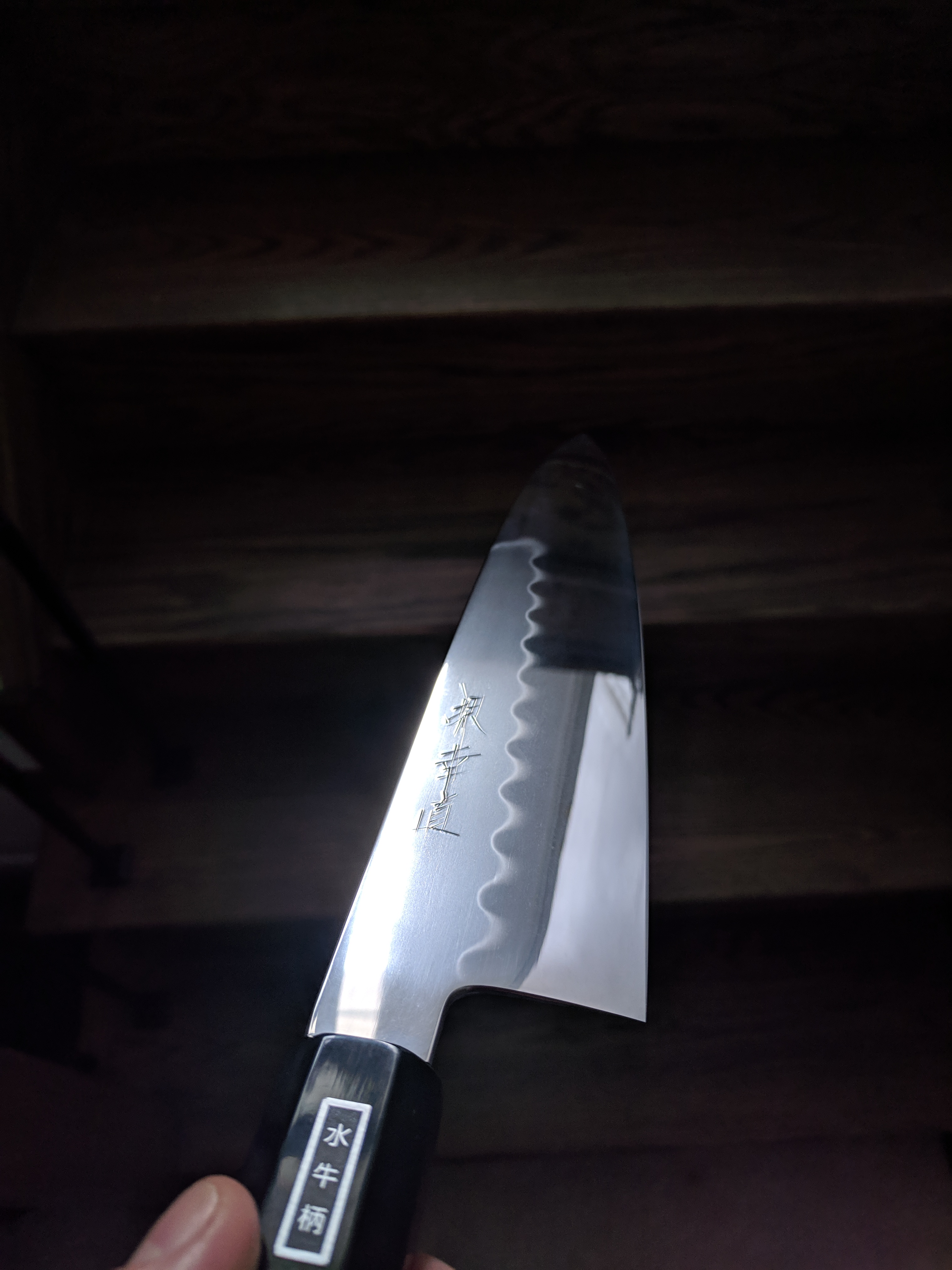 수공 단조작업이 있는 칼은 많은 경우 칼날 면이 매끄럽지 않게 마무리됩니다. 다마스커스가 아니라도 일부러 장식적인 모양을 만들어놓는 경우도 제법 많은데, 심미적인 이유도 있습니다만 실제 사용할 때도 특성이 달라집니다. 칼날 면이 매끄럽지 않고 우둘두둘한 부분이 많을수록 절삭시 음식물에 접촉하는 면적이 좁아집니다. 즉 마찰이 더 적게 일어난다는 것입니다.
