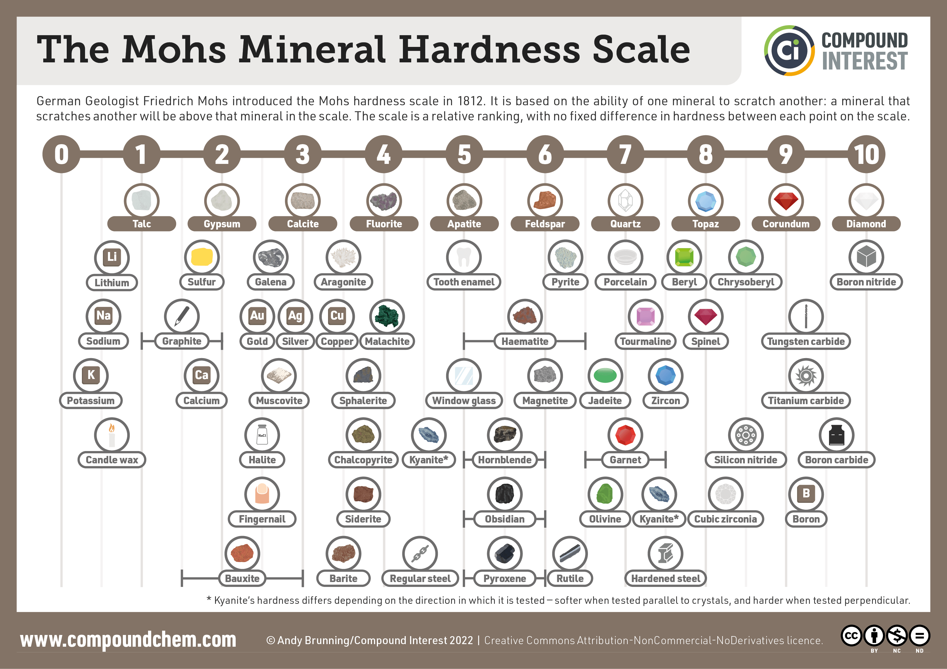영어로는 Hardness. 딱딱한 정도입니다. 강도와는 다릅니다. 엄밀하게 정의된 개념은 아니지만, 통념으로 이야기하자면 ‘긁힘에 강한 정도’를 의미합니다. 대중적으로는 모스 경도가 잘 알려져 있지요.