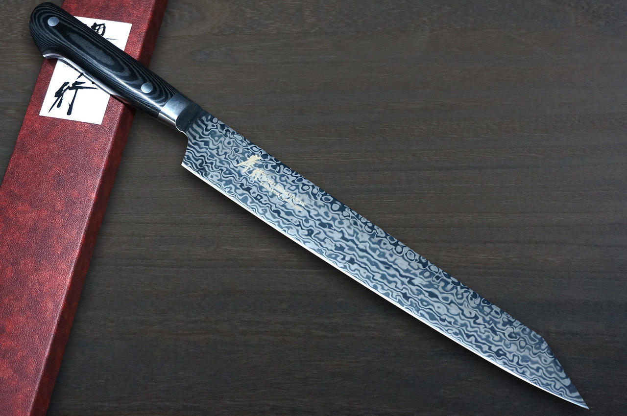 슬라이서는 기본적으로는 육고기를 작업하는 데 쓰입니다. 육사시미를 뜨거나 고기덩이에서 포를 뜰 때, 또는 생고기 덩어리나 바베큐를 자를 때 쓰지요. 물론 야나기와 비슷하게 칼날폭이 얇고 기니까 야나기 대용으로 생선회를 떠도 되는데 (다만 양각날 특성상 야나기만큼 잘 떠지게 연마하기는 어렵습니다.), 기본적으로는 무언가를 떠낼 때 적합합니다. 생선 껍질을 벗기고 살덩어리를 떠내는 오로시 작업을 하는 칼로도 많이 씁니다.