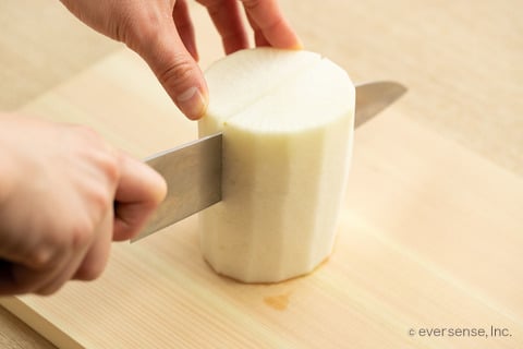 집에서 산토쿠를 주로 사용하다가 규토를 사용하게 되면, 다른 것보다 크게 느껴질 수 있는 건 절삭력은 좋지만 자르고 난 후 날에 ‘담아 올리는’게 어렵다는 겁니다. 산토쿠는 끝이 뭉뚝하고 곡률이 별로 없기 때문에 자른 후에 자른 채소나 김치를 담아 옮기는 게 쉬운데요. 셰프 나이프는 상대적으로 조금 어렵습니다. 그래서 고깃덩어리처럼 큰 걸 자를 때는 규토가 좋은데, 채소처럼 자르기 쉬운 걸 자를 때는 산토쿠나 나키리를 쓰는 게 좋다고 생각합니다.