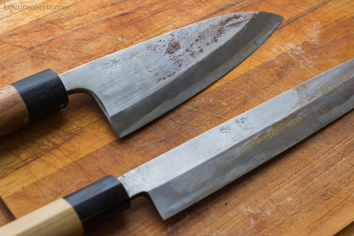 탄소강 편각날 칼은 우라스키에 녹이 스는 걸 신경써야합니다. 우라면을 숫돌로 문지르더라도 오목한 우라스키에는 숫돌이 닿지 않으므로 직접 제거를 해 줘야 합니다. 우라스키에 붉은 녹이 깊이 파고들다보면 칼의 수명이 끝납니다.
