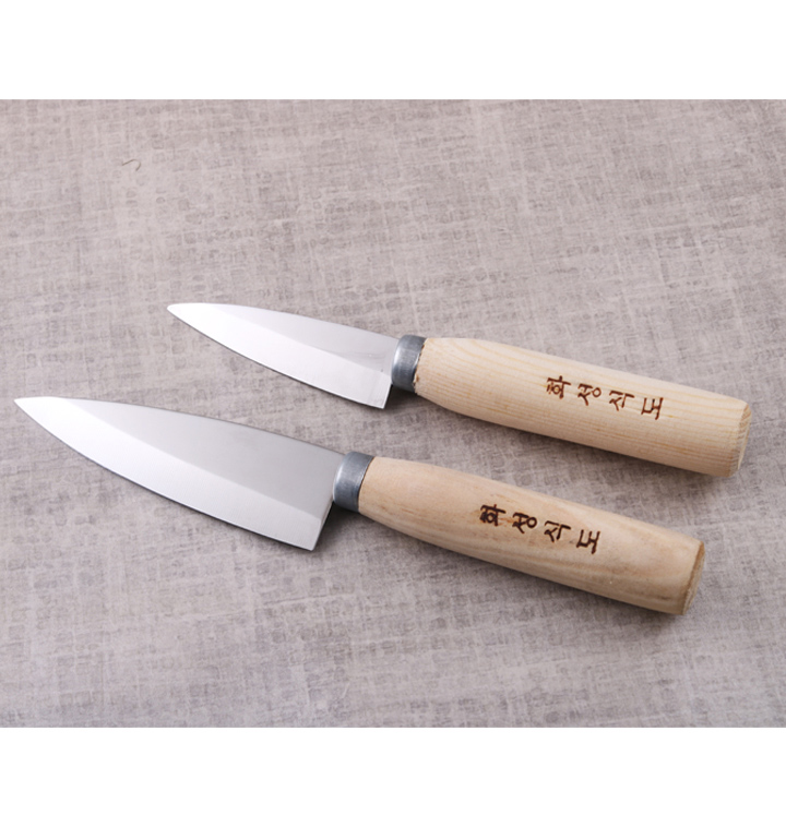 굴을 포함한 조개의 껍질을 열고 살을 분리하기 위한 칼입니다. 형태는 다양한데, 쓰기 편하게 아주 짧은 것들도 많습니다. 주관적으로 조개칼은 좋은 것보다는 가격이 저렴한 걸 쓰는 게 좋다고 생각하는데요. 조개를 까는 작업은 어떻게 생각해도 칼에 부담을 많이 주기 때문에, 좋은 칼을 쓰는 것보다는 칼을 자주 바꾸는 게 현대기술 생산성 생각하면 더 나을 것 같기 때문입니다.