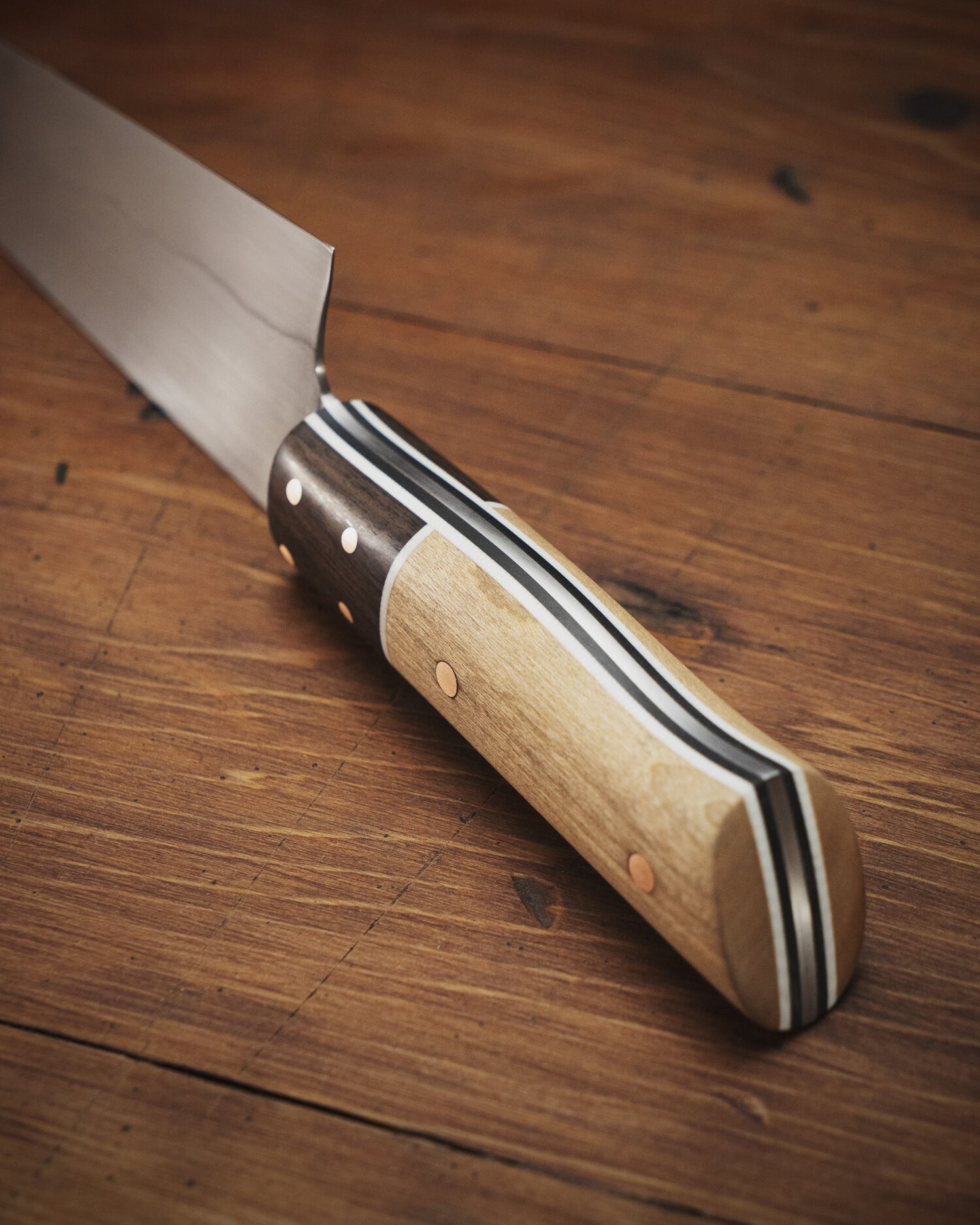 그렇지만 고급 칼에는 나무 손잡이도 많이 씁니다. 좋은 나무를 쓰면 잡는 느낌도 좋고, 모양도 아름다워집니다. 대신 플라스틱에 비해서는 관리가 필요하고요. 나무 손잡이도 부패를 막기 위해 이런저런 처리는 합니다만, 어쨌든 물에 계속 담가두거나 하지는 않는 게 좋습니다. 나무는 수종에 따른 밀도차이는 있습니다만, 대체로 어쨌든 플라스틱보다는 무겁습니다. 흑단처럼 물보다 비중이 큰 수종을 쓰면 제법 무겁고요.