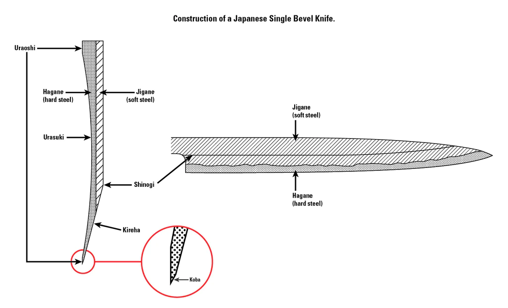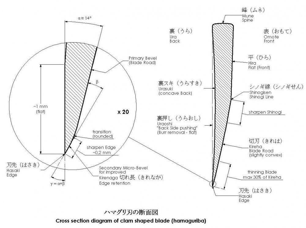 우라가 없는 편각날 칼은 실질적으로 날끝은 1:9 정도의 비대칭 양각날이라 생각해도 됩니다. 우라가 있는 칼도 완벽하게 편각날을 세우면 날끝이 쉽게 손상되는 경향이 있어, 끝부분이 둔각인 이중날(이토)을 만들거나 날끝의 우라오시를 살짝 갈아 비대칭 양각날을 만들어놓기도 합니다. 절삭력을 포기하고 내구성을 확보하는 식의 연마를 하는 경우가 드물지 않다는 거지요.