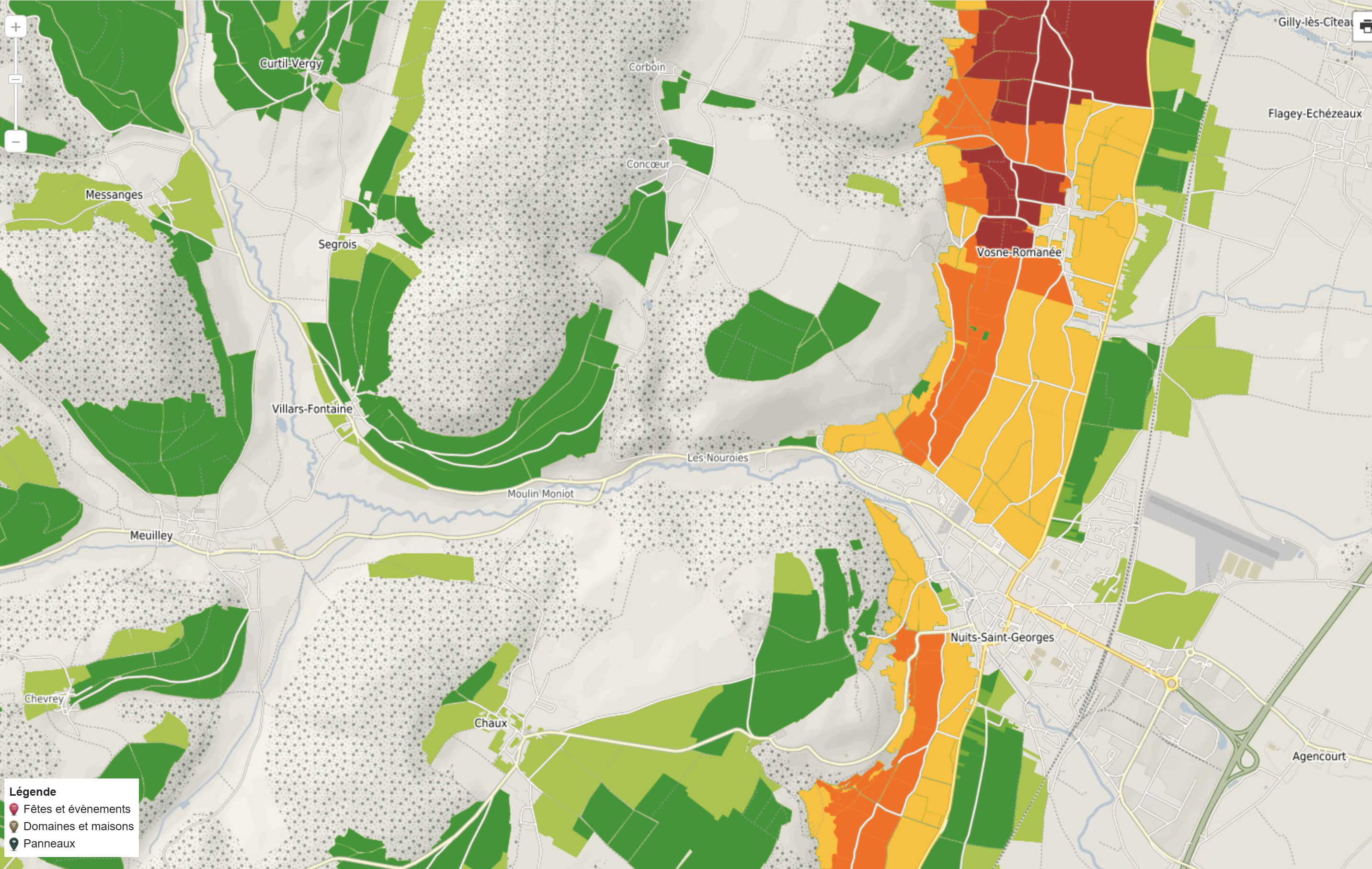 그리고 코뮈날급보다 더 아래쪽 저지대와 더 위쪽 고지대에 레지오날급 밭들이 있는데요. 이 레지오날급 밭들 중 언덕 고지대와 아예 언덕 넘어 서쪽 골짜기 밑 구릉지대에 펼쳐진 밭들이 오-코트 드 뉘입니다.