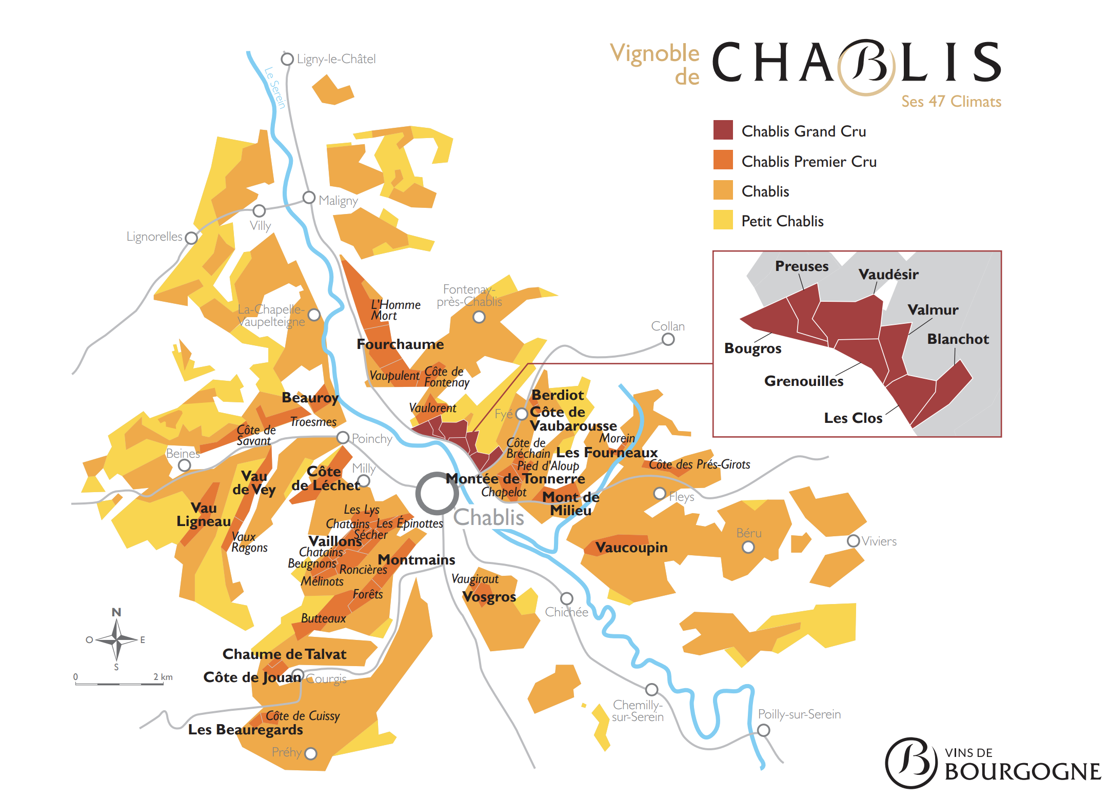 코트 도르의 클리마 등급에 대해 간단히 이야기하자면, 크뤼가 남북으로 이어지는 지대가 있습니다. 쭉 이어지는 언덕의 중간 사면에 해당하는데, 그 중에도 가운데쪽이 그랑 크뤼고 그 그랑 크뤼의 위쪽과 아래쪽으로 프르미에 크뤼가 감싸고 있는 경향이 있습니다. 그리고 그런 프르미에 크뤼 바깥으로 코뮈날(빌라쥬)급 클리마가 있지요.