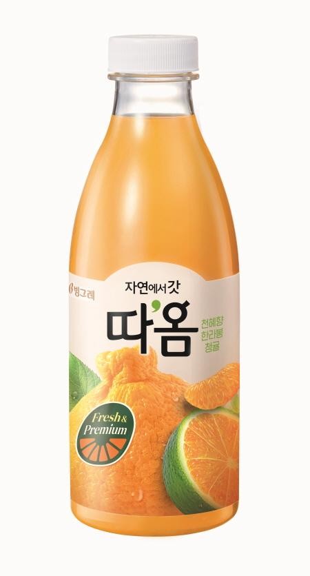 : 빙그레에서 나온 고급 냉장 주스. 감귤농축액+귤착즙액+배농축액+한라봉퓨레+한라봉착즙액+청귤착즙액+천혜향착즙액 구성입니다.